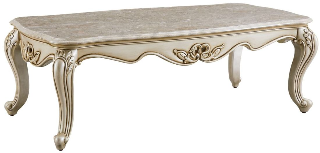 The Monique Cocktail Table features a pearl finish, curved legs and a unique design on the base of the table.Read More
