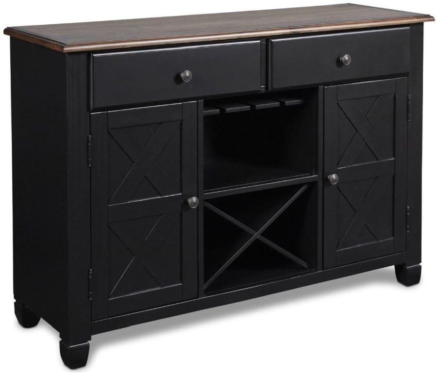 This Prairie Point server features two doors, two drawers, glass and bottle storage, and a black finish.