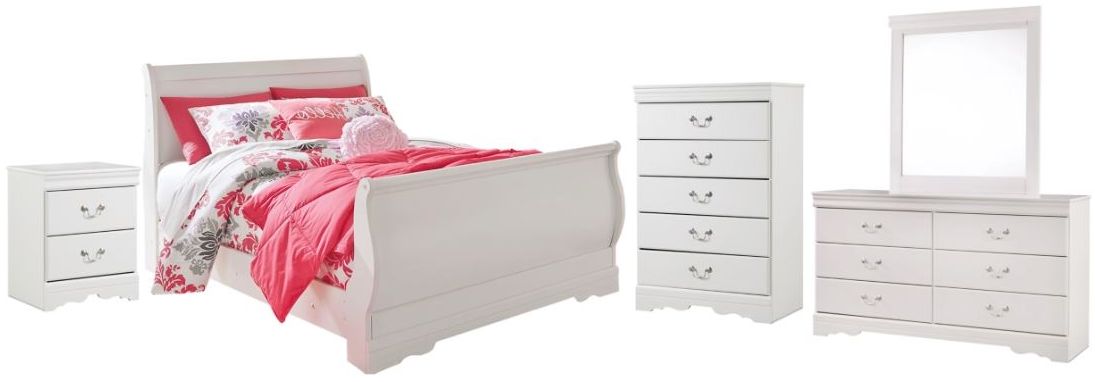 Includes sleigh bed (with headboard, footboard and rails), 6-drawer dresser with mirror, 5-drawer chest and 2-drawer nightstand