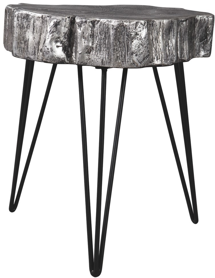Sleek hairpin legs in a black finish on the Dellman accent table fuse together minimalist style with the rustic appeal of the replicated wood slice tabletop.