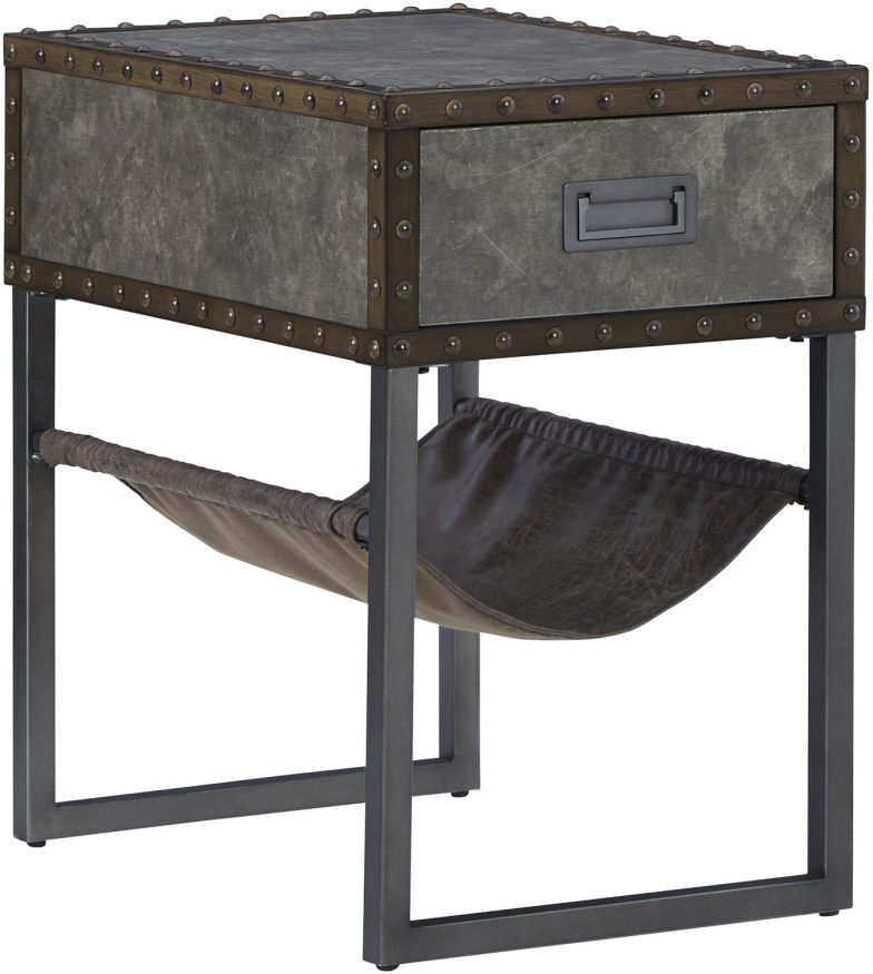 Its metal accent trim and bronze-tone metal base are ready to embrace the modern demands of everyday life. A drawer with a fully finished interior provides additional storage, while the faux leather hanging basket keeps your books and magazines within easy reach.Read More