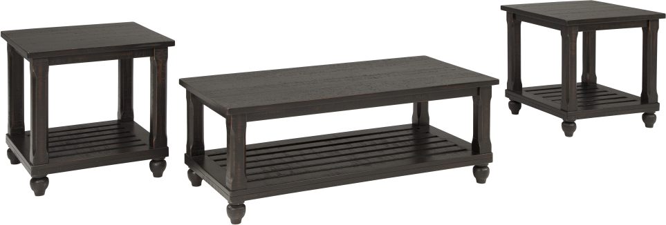 The Mallacar 3-piece table set features a distressed finish, slat-style lower shelf design, and turned feet for a cohesive arrangement of shelving and organization in your living room.