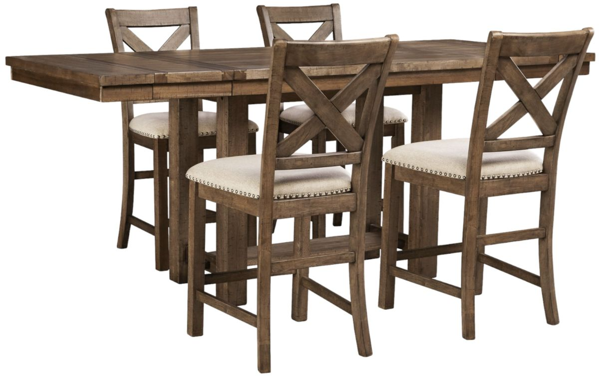 This counter height dining table set with upholstered bar stools elevates the art of casual rustic style. Notable refinements include through-tenon touches, plank-effect tabletop and distressed nutmeg finish that’s warm and welcoming. The space-efficient scale is especially suited to loft-style living, but two optional leaves ensure there’s plenty of space for parties up to eight.