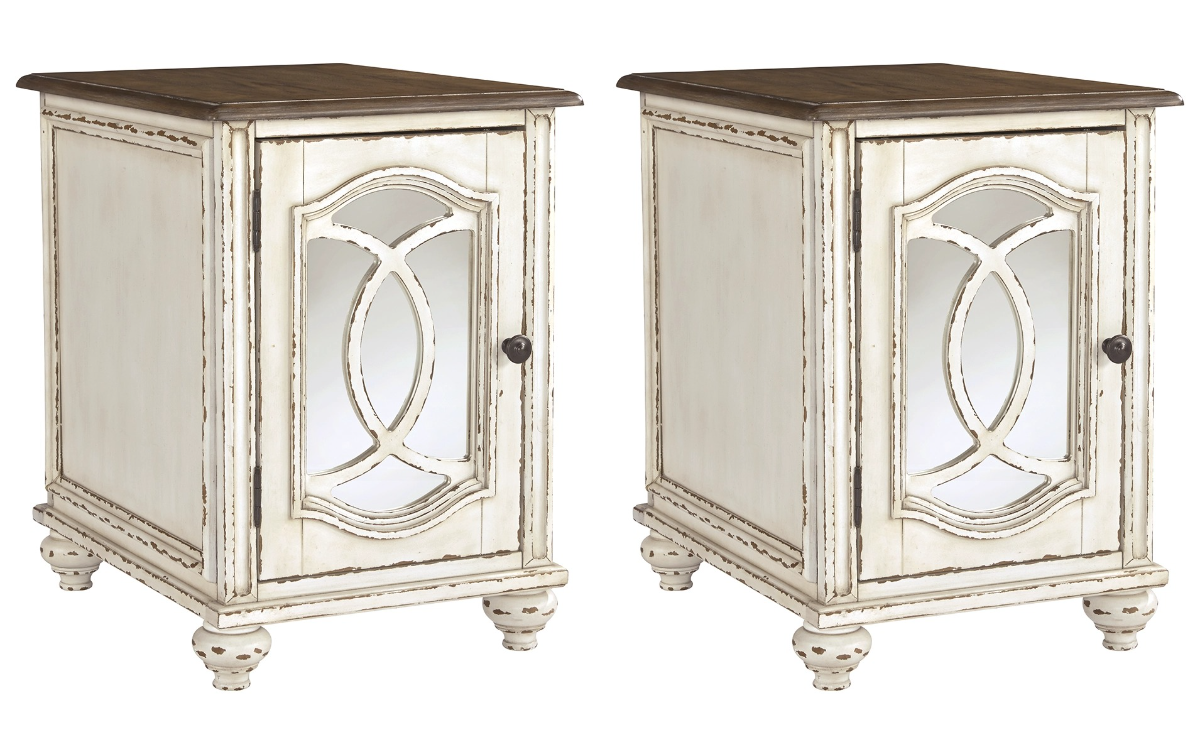 Elevating the art of traditional cottage styling, this 2-piece chairside end table set is sure to serve you beautifully for years to come. Antiqued two-tone aesthetic blends a chipped white with a distressed wood finished top for added charm. Cabinet door features inset mirror with filigree moulding for a fanciful twist.Read More