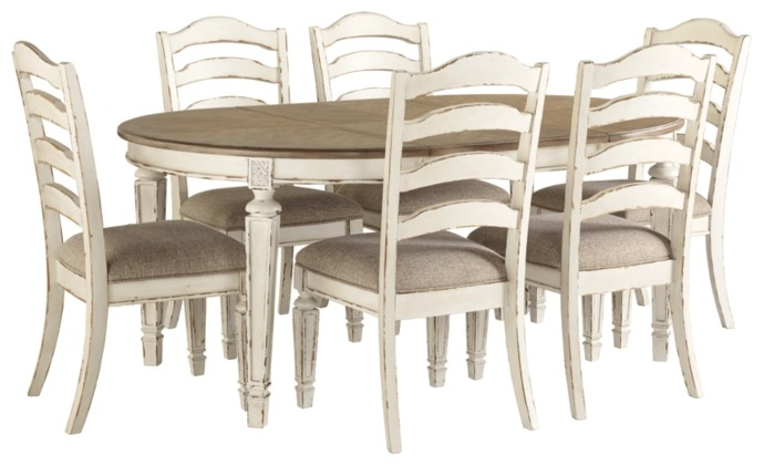 Bon appétit. With its rounded ladderback styling, chipped white finish, and plushly cushioned seat, the Realyn dining room chair has all the right ingredients for a French country-inspired feast for the eyes.