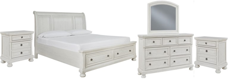 Includes California king sleigh bed with storage (headboard, storage footboard and rails with roll slats), 7-drawer dresser with mirror, and two 2-drawer nightstands