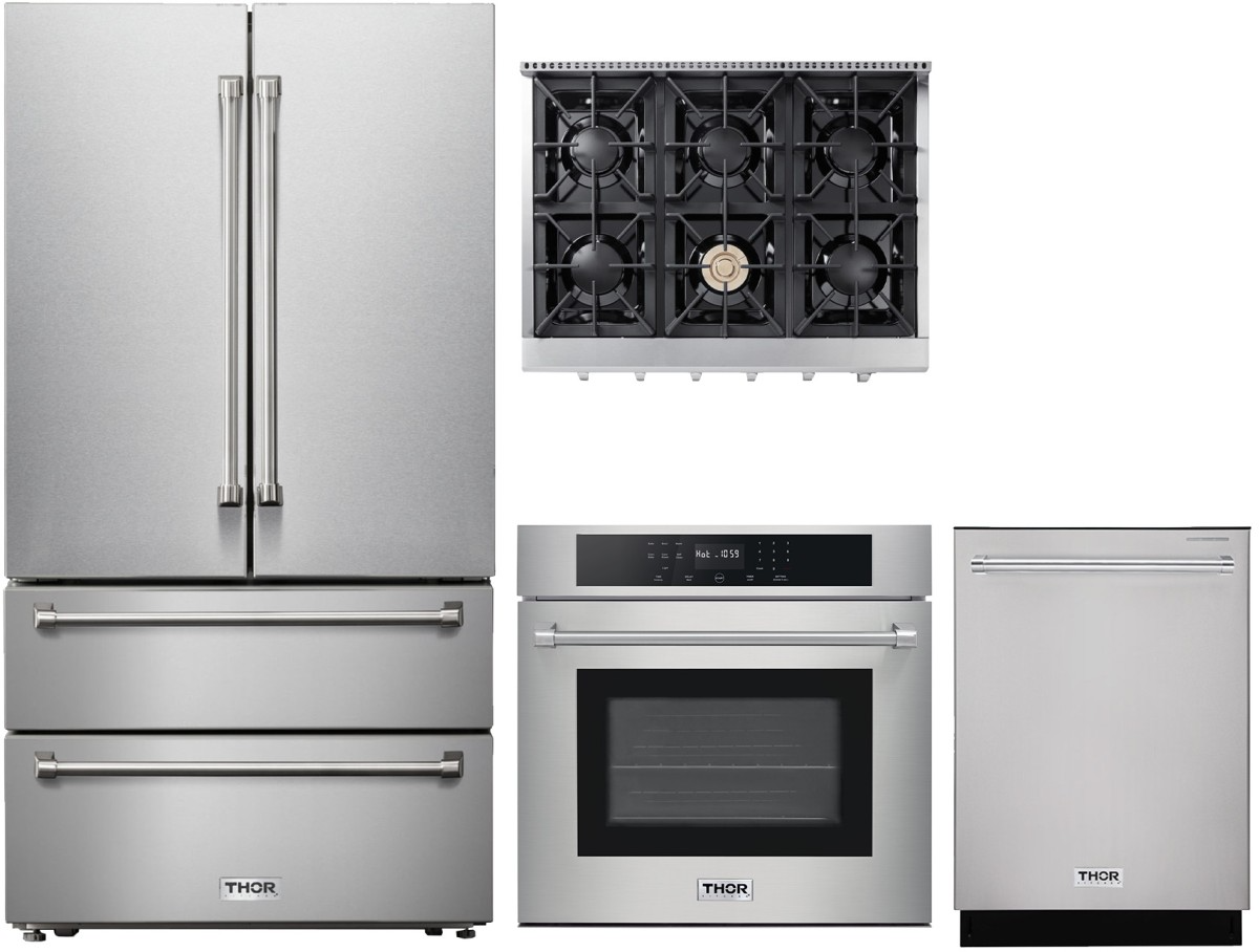 Thor Kitchen® 4 Piece Stainless Steel Kitchen Package with a French door refrigerator, single electric wall oven, gas rangetop and built in dishwasher.Read More
